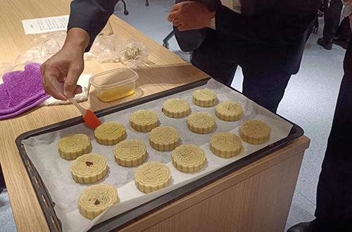 活動現(xiàn)場,桌上早已備好紅豆沙餡、面粉、糖漿、花生油等食材以及電子秤、模具等工具。大家圍成一桌,分工合作,相互配合,一步步做好揉搓面皮、捏皮成型、放入餡料等工序,最后通過模具壓制成型,制作出了造型美觀的月餅?;顒蝇F(xiàn)場充滿了歡聲笑語,一派熱鬧非凡、其樂融融的節(jié)前景象。
