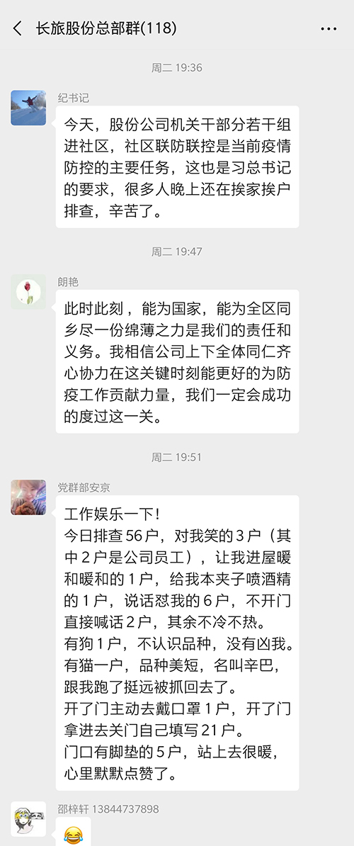 下班后,為了緩解疲勞,打氣加油,相互之間還在工作群內(nèi)開(kāi)起玩笑,幽默的總結(jié)一天的工作情況,伴著僅有的一點(diǎn)歡樂(lè)和一天的疲憊憨憨入睡,養(yǎng)足精神繼續(xù)投身第二天的工作中,用實(shí)際行動(dòng)兌現(xiàn)“疫情不除,我們不退”的莊重誓言。